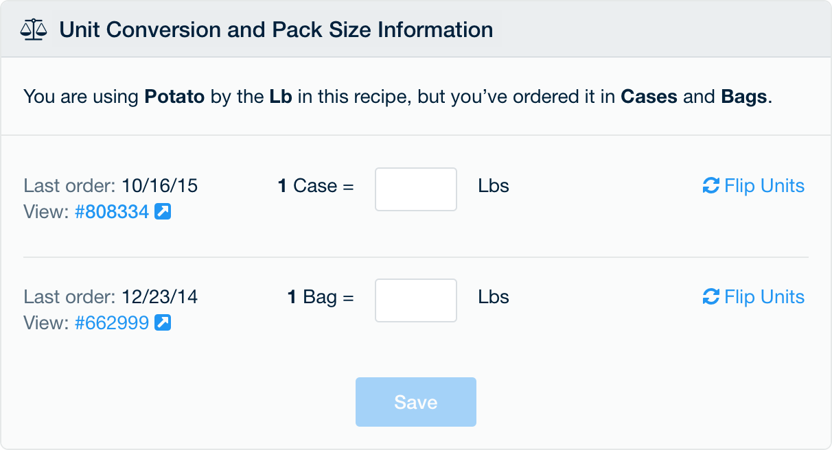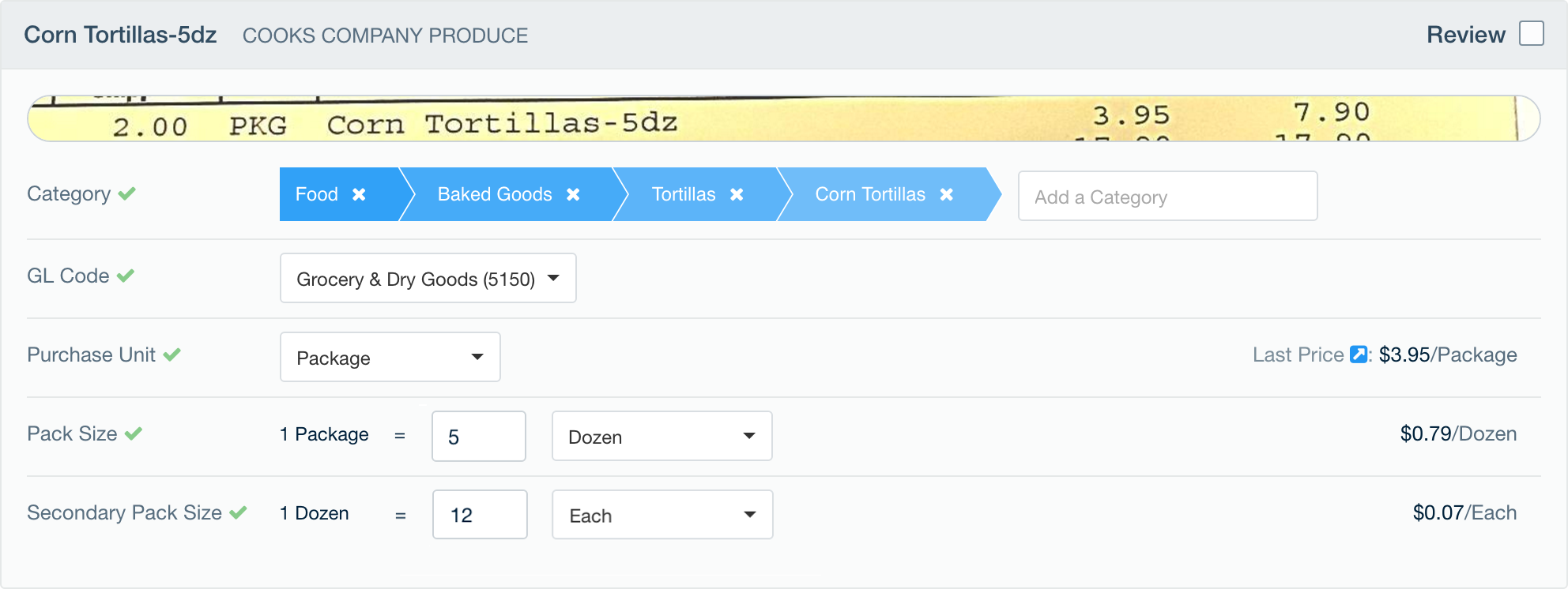 Letting users review and change an item's pack size was important, because this price per unit would later be used to calculate an item's value in both recipes and inventory.
