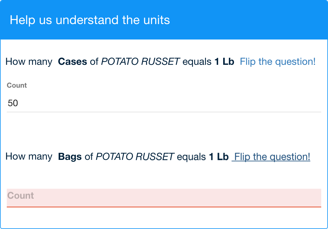 Problem: users were confused for numerous items like fennel and cilantro, which come by non-standard units like bulb or bunch. If a recipe used 1 bulb of fennel, the popup would ask: "How many Each of FENNEL equals 1 Bulb?" but we basically wanted to know "1 Each = ____ Bulb". The answer for this case is 1.